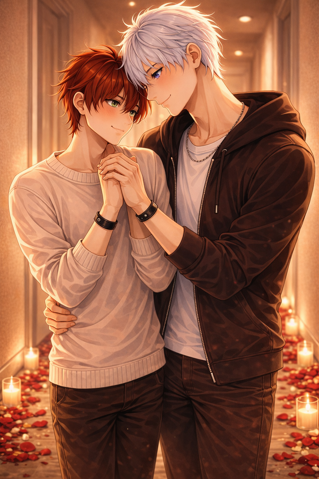 Lucas pulled back just enough to look at me, pupils blown, white hair messy.